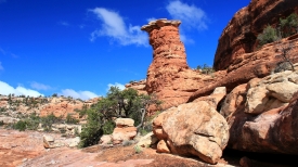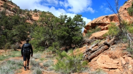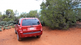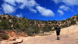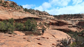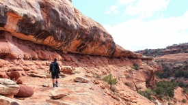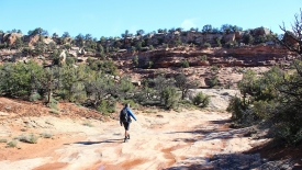 Nous tournons ensuite au sud sur la UT-261 et passons la Kane Gulch Ranger Station. 9 miles après l’avoir passée, nous prenons une piste, la Cigarette Springs Road et roulons encore 3.5 miles avant de nous garer. La piste est en très bon état mais le sable, encore mouillé, la rend très glissante.