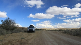 Nous poursuivons la piste et garons la voiture un peu au hasard. Nous avons vu au loin une mesa et quelques rochers (cailloux !) qui ont l’air intéressants.