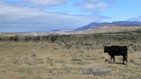 Quelques vaches se baladent, l’air un peu mélancolique. Peut-être attendent-elles des jours meilleurs. Ca n’a pas l’air d’être la fête tous les jours, ici, avec ces pâturages dépourvus d’herbe.
