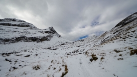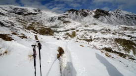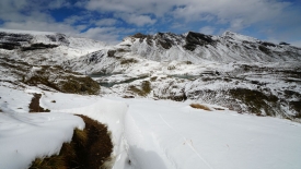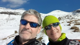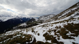 La neige est lourde et mouillée. Piétinée par les pas des randonneurs qui nous ont précédés, elle fond, se mélange à la terre pour former une jolie pâte brunâtre, que nous appelons poutchichaka, un mot d’enfant de Stefano pour désigner la boue. Nous nous félicitons d’avoir imperméabilisé nos chaussures avant de partir, mais doutons néanmoins de conserver les pieds au sec.