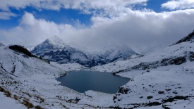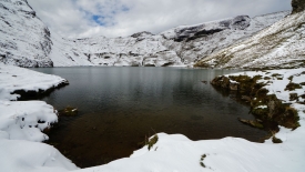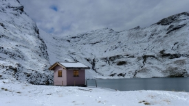 Sur les rives du lac, quelques randonneurs-touristes s’activent avec leur téléphone. Deux cyclistes, poussant péniblement leur vélo dans la neige, doivent regretter leur choix.