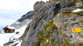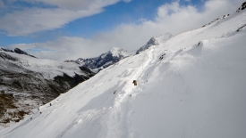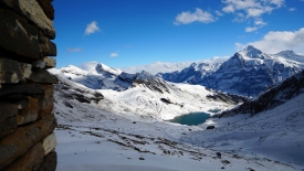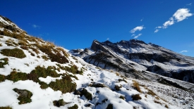 Des traces de raquettes marquent le sentier qui monte à Faulhorn. Même si par endroit, nous nous enfonçons jusqu’aux mollets, c’est plutôt à cause de la neige accumulée par le vent. La couche reste peu épaisse. Ce sont vraiment les premières neiges de l’hiver 2020-2021.