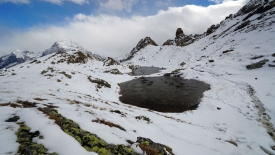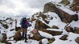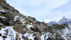 Devant nous, un champ de rochers, avec quelques passages un escarpés, rendus glissants par la neige. Néanmoins, rien de bien méchant, à condition de prendre le temps d’évaluer l’endroit où poser les pieds.