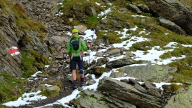 Le sentier reste à hauteur constante et nous mène au travers de blocs de rocher. Stefano décrit les lieux comme « le grand dérangement ».
