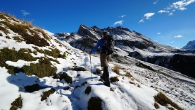 La première longueur se fait en papotant allègrement. Notamment des conditions météo et du temps magnifique. Nous ne savons pas s’il durera, mais la surprise est de taille. Après le premier virage, la pente s’accentue sans prévenir. Allez savoir pourquoi mais notre conversation se tarit. D’autant que nous marchons d’un bon pas, afin de nous réchauffer. C’est qu’il ne fait pas chaud, à 1’800 mètres d’altitude.
