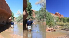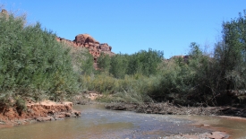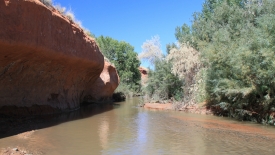 Nous suivons la rivière en recherchant un canyon s’enfonçant dans les terres vers la droite. La progression n’est pas facile : le sol est sablonneux, nous devons traverser fréquemment la rivière, la longer, voire marcher dedans lorsque les rives sont impraticables à cause de la végétation dense et inamicale (ça pique !).