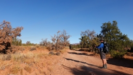 Oui, ben quoi, encore, oui. Le Government Trail est le moyen le plus court (tout est relatif) pour rejoindre le tiers supérieur du Grand Gulch. Quand je dis le plus court, je parle de temps, par forcément de distance. De là où nous nous sommes garés, il nous faut marcher près de 6 km pour rejoindre le bord du rim. Mais ce sont 6 km de plat, que nous couvrons en 1h10. Descendre par Polly’s Canyon, ou par Bullet Canyon ou encore par Kane Gulch nous prendrait au moins trois fois plus de temps.