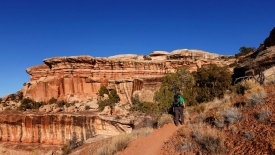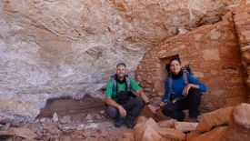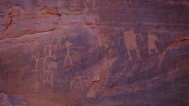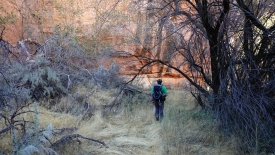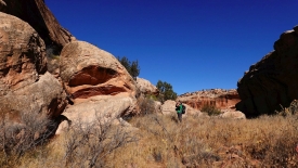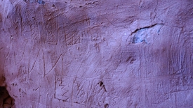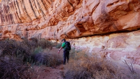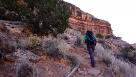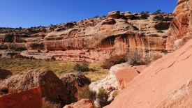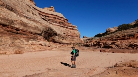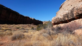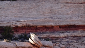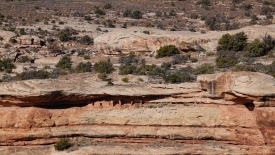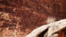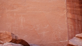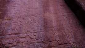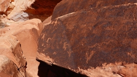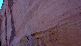 Nous suivons un faint trail qui grimpe hors wash pour aller explorer un replat et surtout les abords de la falaise. Dans le Grand Gulch, un faint trail peut mener à deux choses bien différentes : soit une place idéale pour le camping, soit à des pétroglyphes ou des ruines. Plusieurs fois, au cours de notre randonnée du jour, nous sommes tombés sur des emplacements de camping. Mais là, quelques pétroglyphes justifient le sentier.