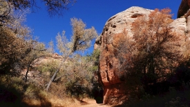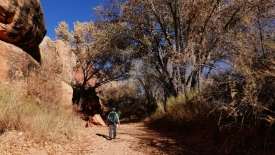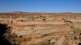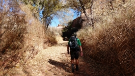 Nous ne nous contentons pas de suivre le wash. Nous nous rapprochons des falaises lorsqu’il s’élargit, dans l’espoir de trouver quelques pétroglyphes ou mieux, quelques petits greniers.