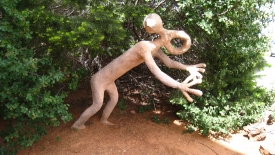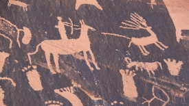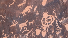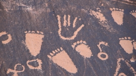 Bordant le sentier qui mène aux ruines, des représentations de personnages ou symboles apparaissant sur des pétroglyphes.