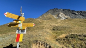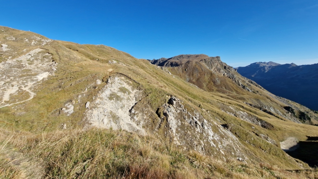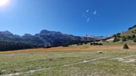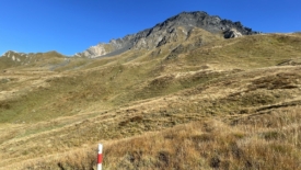 C’est plat pour exactement 330 mètres. Commence ensuite une montée infernale dans une prairie au milieu des arolles où le martellement des sabots du bétail n’a pas ménagé le sentier.
