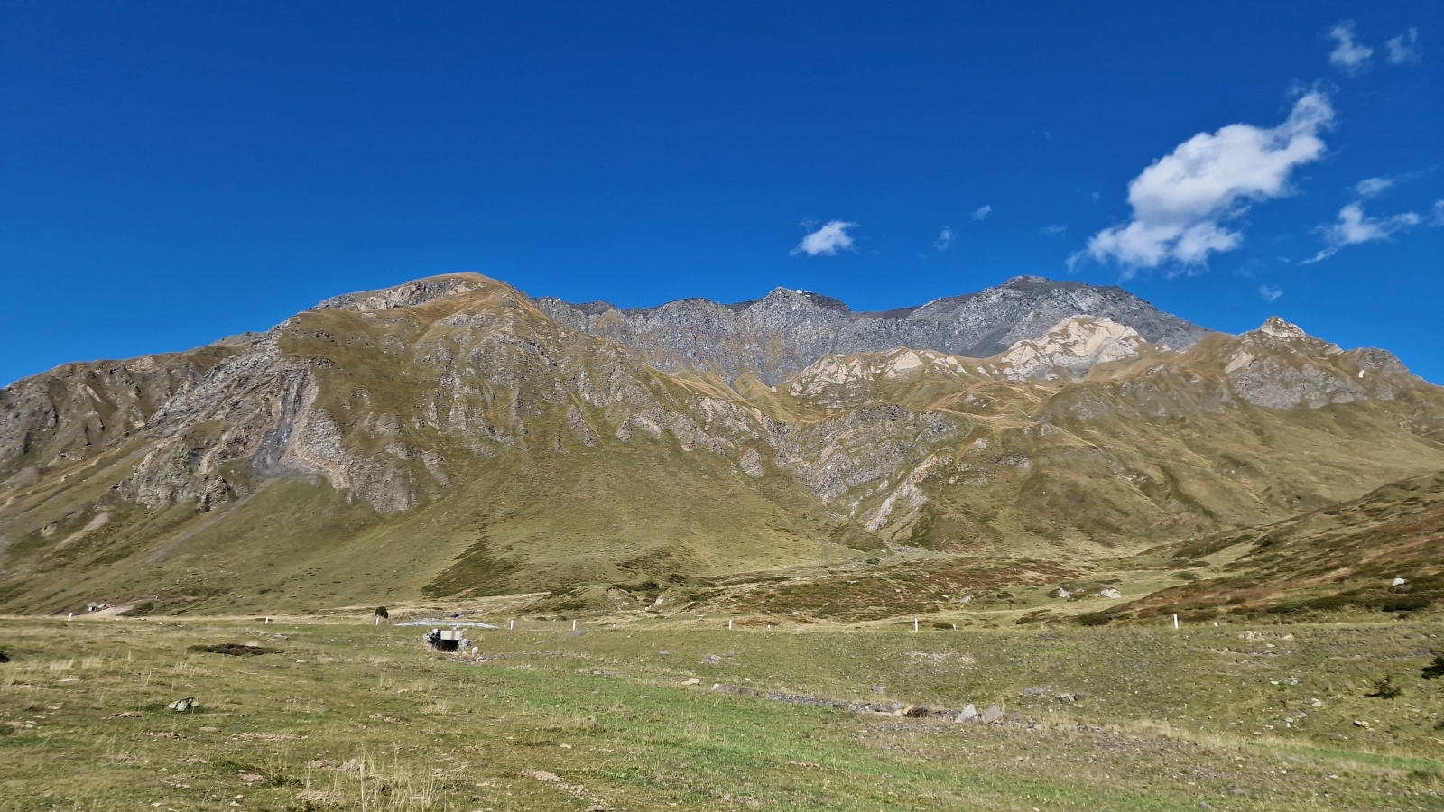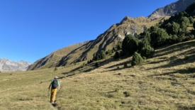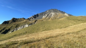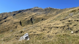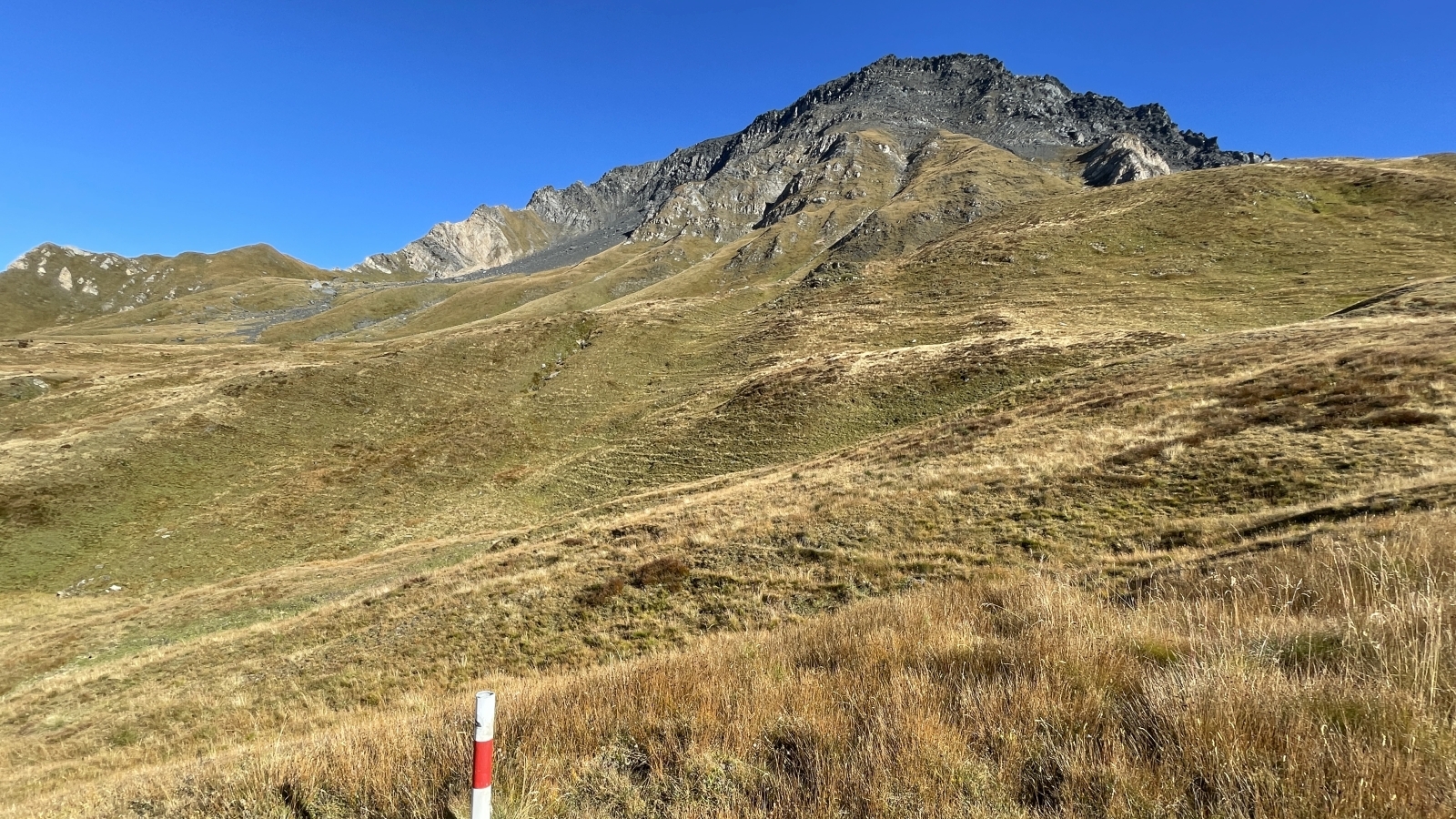 Nous reprenons la montée. Les arolles se raréfient puis disparaissent, laissant la place à une prairie jaune et sèche, dominée par l’imposant pizzo del Corvo, bien nommé de par sa couleur noire corbeau.