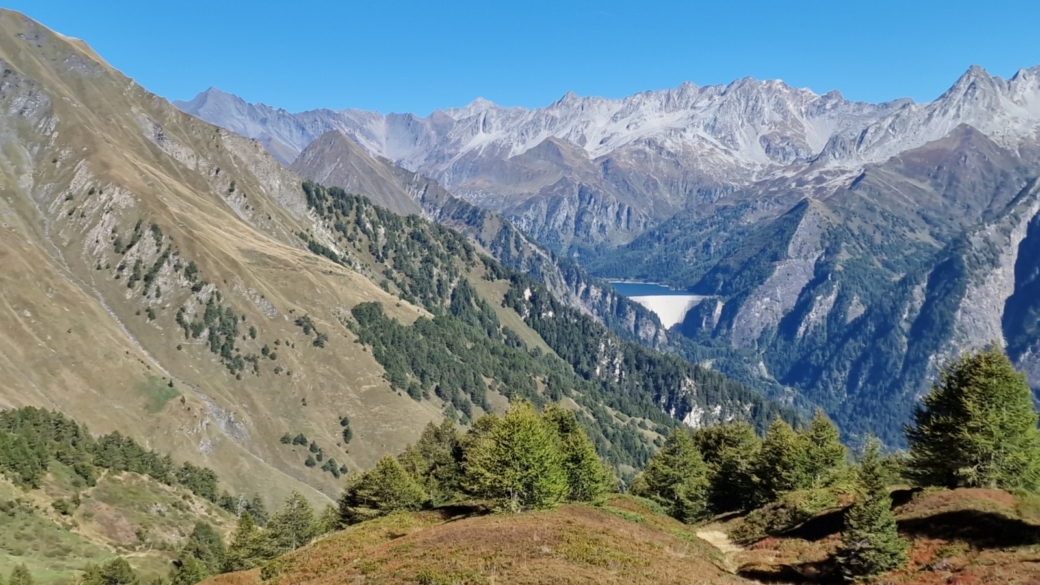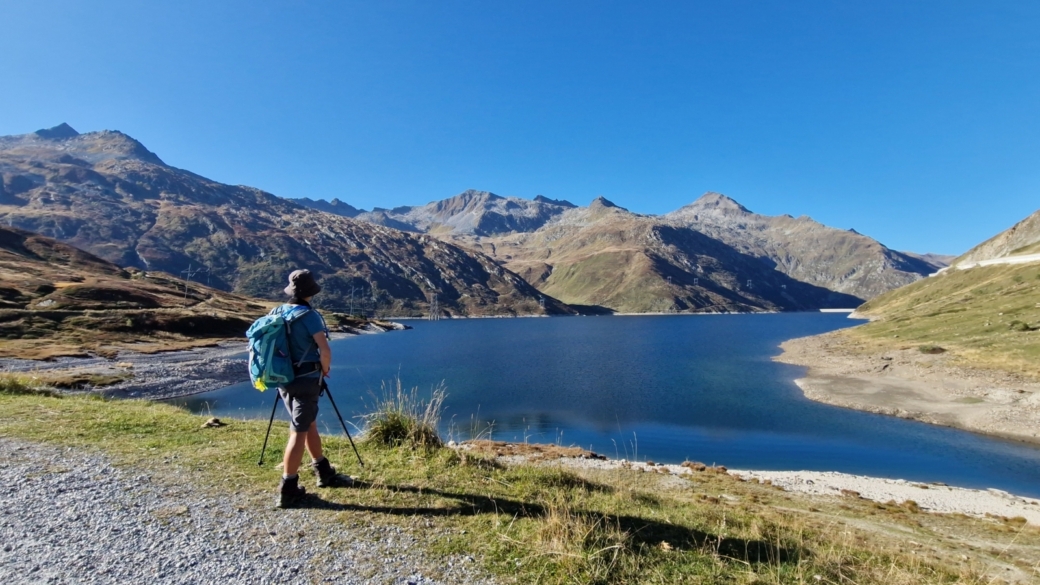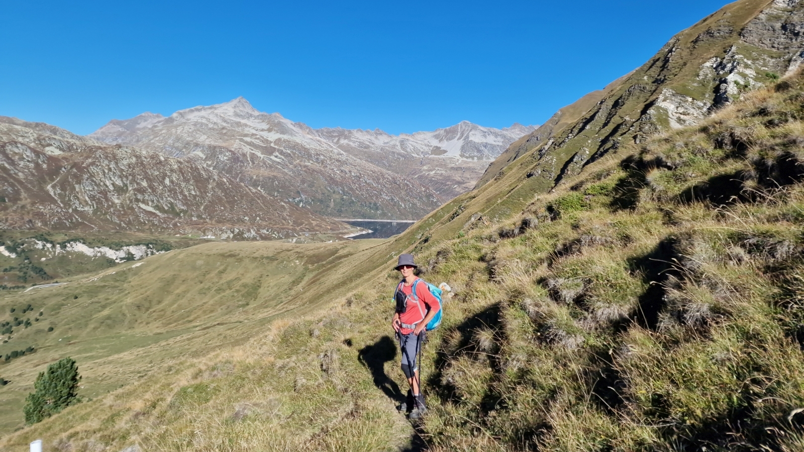 A distance, derrière nous, nous voyons le barrage du lago di Luzzone.