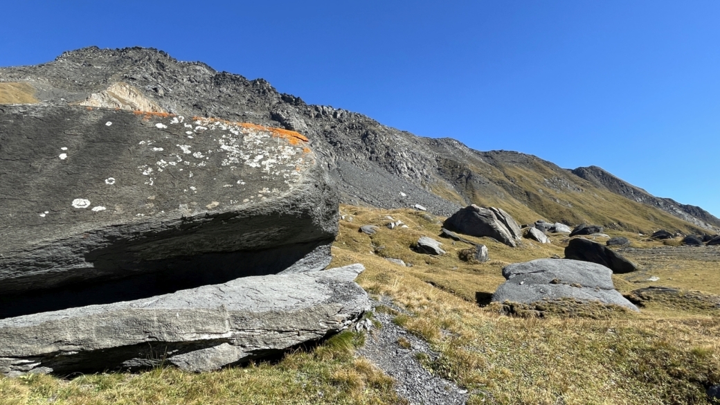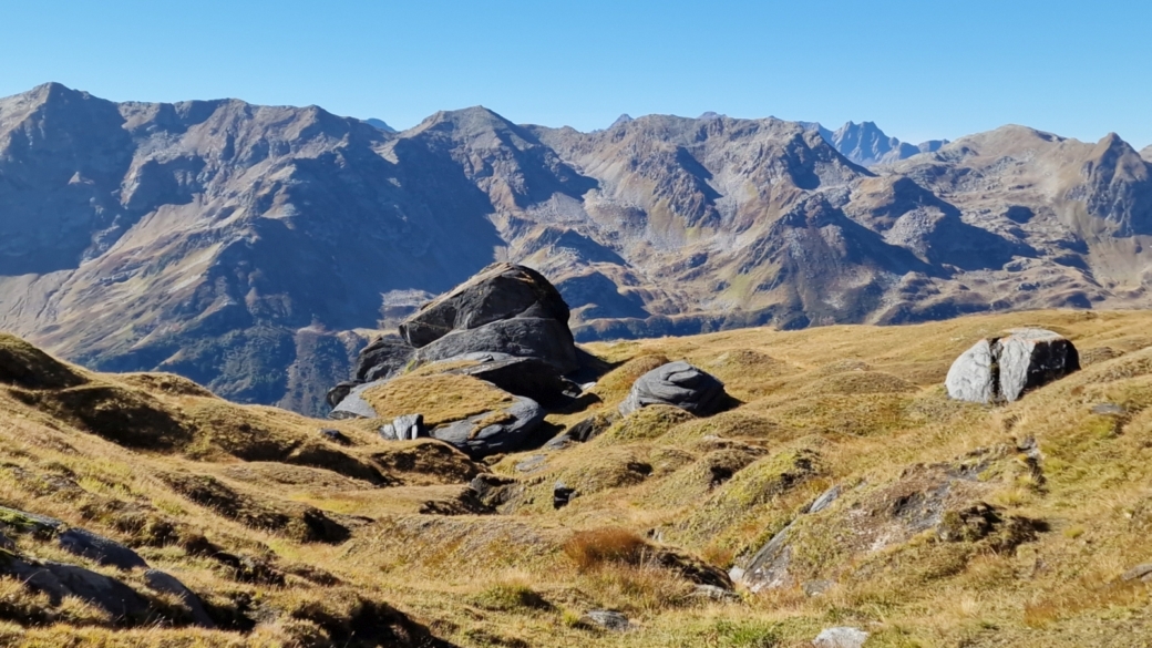 Voici la vue sur notre droite, sur le versant opposé du val di Blenio. Devant, quelques rochers plus noirs que d’autres, issus de la Gana Negra.