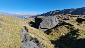 Commence alors l’enchantement. D’une part le sentier a une belle tendance à descendre et d’autre part des rochers noirs, descendus tout droit du pizzo del Corvo, parsèment la prairie.