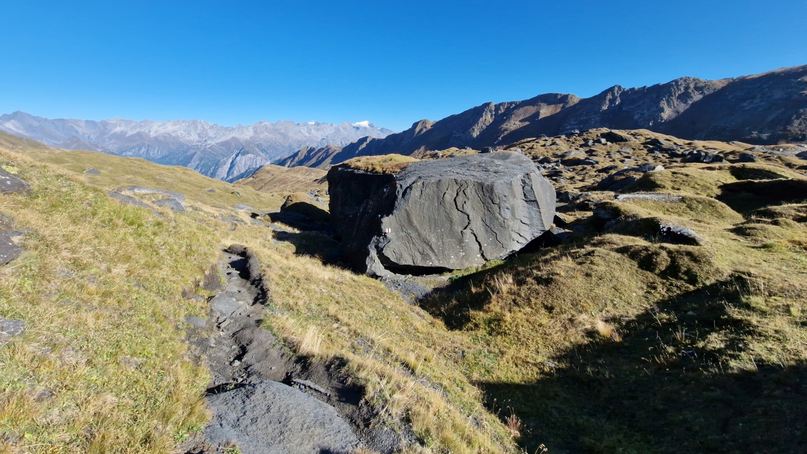 La descente jusqu’à l’alpage abandonné est clairement plus rapide que la montée. Entre deux pas, de temps en temps, nous levons la tête pour admirer le paysage. Sur le flanc de La Bianca, un de ces sillons s’appelle le val d’Inferno – val d’Enfer -. Tout est dit.