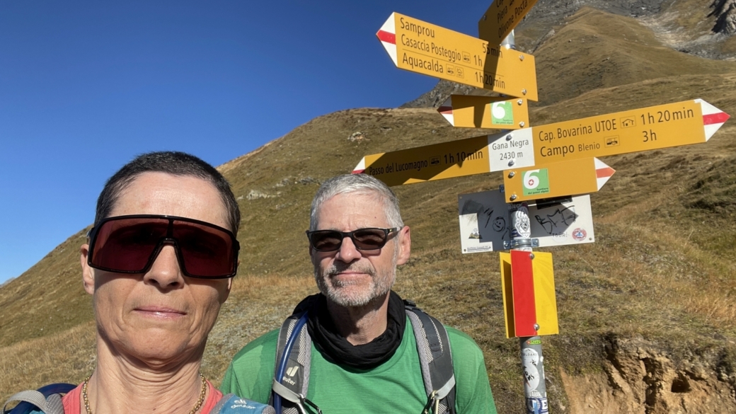 Depuis un moment déjà nous avons dans l’idée de passer quelques jours non loin du passo del Lucomagno. A quelques kilomètres du col, nous avions repéré, en 2023, un parking payant qui, en plus d’accueillir des voitures, offre 4 emplacements pour camping-cars. Pas d’électricité mais des toilettes et de l’eau (potable) sont à disposition. Pas de réservation possible, la disponibilité se constatant sur place, au moment d’arriver. Nous avions donc en plan B le camping du TCS à Olivone, moins pratique car plus éloigné des départs de randonnée. Mais, comme dit si bien le dicton, beggars can’t be choosy. Partis de la maison hier, jeudi, après le déjeuner, nous arrivons sur place vers 16h. Une des quatre places est libre, que nous nous empressons d’occuper, puis faisons le check-in sur l’app Parkn’Sleep. Au moins 4 ou 5 autres campers sont garés sur des places « normales », lanterneaux ouverts, nous laissant penser qu’ils sont là aussi pour la nuit.