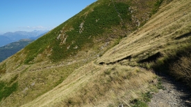 Si nous voulons faire une boucle, et compte tenu de l’heure, nous devons renoncer à pousser jusqu’au Monte Bar. Tant pis, ce sera pour une prochaine fois. Un peu après la Cima Moncucco, nous laissons le Monte Bar sur notre gauche et descendons, par une pente très raide vers l’Alpe Ladrim.