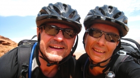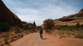 Aujourd’hui, c’est l’anniversaire de Georges… Mon Pôpa… Celui qui dit que pour faire du vélo ce pas n’est le prix du vélo qui compte mais la qualité du mollet… Et donc, pour fêter à notre manière son anniversaire, nous partons pour notre première rando en VTT à Moab. Nous sommes venus 4 fois à Moab et les 3 premières fois avons toujours regardé avec un peu d’envie les bikers partant le matin pour dévaler les sentiers. Cette année, c’est notre tour ! L’idée est de monter vers Canyonlands via une piste, la Gemini Road qui conduit à des ponts, les Gemini Bridges.