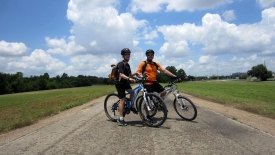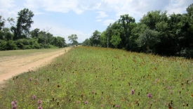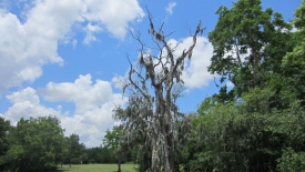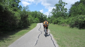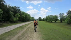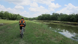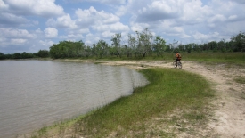 Le paysage ressemble à celui que nous avons vu la semaine passée. Nous roulons sur une digue, sur un chemin recouvert de gros gravillons qui nous font apprécier la double-suspension de nos vélos. Sur notre gauche, George Bush Park que j’imaginais manucuré à la manière de Hermann Park. Mais en fait, il ressemble plus à Memorial Park : point de pelouse mais un immense terrain laissé au « naturel » avec quelques sentiers qui le traversent.
