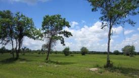 Sur notre gauche, une zone densément boisée. Sur notre droite, des prés verdoyants.