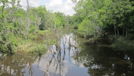 Juste après avoir rejoint le goudron, bien à l’abri sur un petit pont de bois, nous surplombons le bayou.