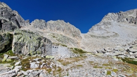 Il est 10h25 quand nous arrivons à l’ancienne cabane militaire, hélas tombée en décrépitude. Elle est référencée sur des anciennes photos comme étant le rifugio Cassina Baggio. Bien entourée par trois murs de pierre, le dernier, maintenant absent, faisant face à la vallée, était une cloison de bois, recouverte de tôle. Tout comme le toit.