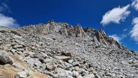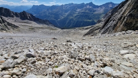 Lorsque je préparais les vacances du mois de juin dernier, j’avais lu le billet d’un couple relatant leur randonnée ici même. La montée finale dans le pierrier était décrite comme éprouvante principalement à cause de la nature du sol. Un pas en avant, trois en arrière ; le terrain n’est que sable et caillasse glissante, écrivait-elle. Cette description nous avait paru un peu exagérée tant la montée avait été aisée. Raide certes, mais agréable. Était-ce l’excitation de la découverte ? Possible. Aujourd’hui, cependant, la musique est différente. Son récit nous semble parfaitement exact, à la virgule près.