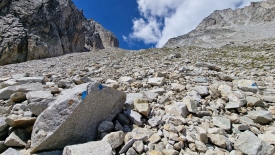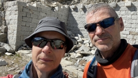 Un groupe d’une dizaine de randonneurs italiens arrive, et avec eux deux chiens, dont un qui aboie sans cesse, sans doute excité à cause de ce paysage spectaculaire. Du coup, nous décidons de prendre un peu de hauteur et de trouver une place abritée pour casser la croûte.