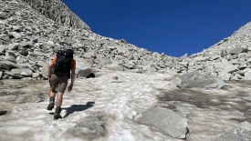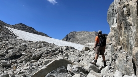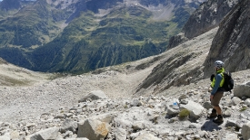 Il est 13h lorsque nous entamons la descente. La glace que l’on voit sur la photo, est un reste de langue glaciaire.