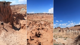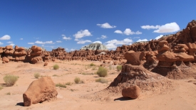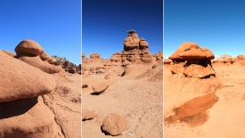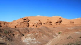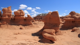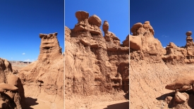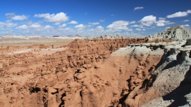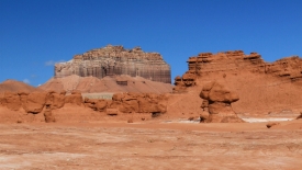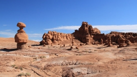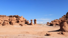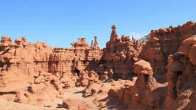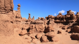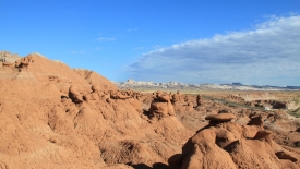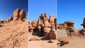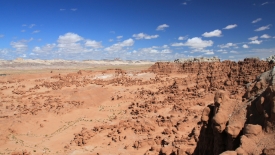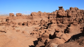 Au détour de chaque courbe, des Goblins surgissent. On voit, au fond, le San Rafael Swell et Temple Mountain n’est pas loin.