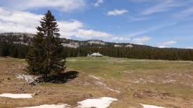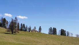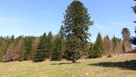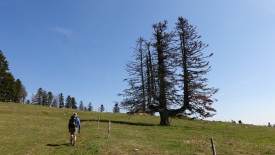 Nous commençons la balade par aller voir de plus près le sapin « chandelier ». Et comme les fils des clôtures n’ont pas encore été tendus, nous traversons le pâturage.
