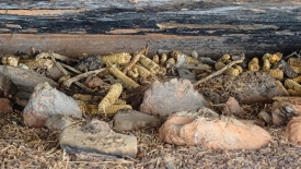 Une anfractuosité, entre deux pierres horizontales, a vraisemblablement servi de poubelle. Haute d’environ 15 cm, elle est remplie de rafles de maïs. Si je pouvais y glisser la main et farfouiller un peu, j’y trouverais à coup sûr des morceaux de poterie et, pourquoi pas, des os de petits mammifères.