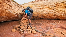 Mais très vite, nous nous disons que les ruines doivent être un niveau plus haut. Nous continuons jusqu’au bout du petit canyon que nous avions suivi. Et bientôt, un amas de pierres nous fait un clin d’œil. Il semble bien que nous soyons sur le bon chemin car ce tas de pierre constitue une aide au franchissement d’un passage un peu tricky. Stefano s’empresse d’empiler quelques pierres de plus, histoire que j’ai une chance de passer. Malgré cela, il faudra me quand même une main aidante pour que je puisse me hisser.