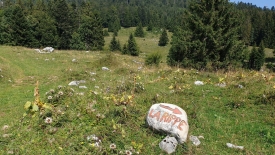 La descente se fait tout tranquillement, sur une piste forestière où nous pouvons marcher de front. Nous discutons de choses et d’autres, d’anecdotes du travail, et côté Stefano, des déménagements passés et à venir. Parfois, nous restons tout simplement silencieux ou chantons. Tout à l’heure nous avons entendu un groupe de trois randonneurs chanter une chanson qui parlait de gros curé sur l’air de « Malbrouk s’en va en guerre ». Alors nous, nous inventons d’autres paroles qui parlent de lapins et de foin.