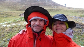 D’abord quelques gouttes éparses. Qui très vite se densifient. Allez disons-le : il pleut à verse. Nous sortons nos chapeaux de pluie de compétition et décidons de tester l’imperméabilité de nos vestes en Pertex. Test qui échoue lamentablement : très vite, nous sentons l’humidité au niveau des commissures des coudes.