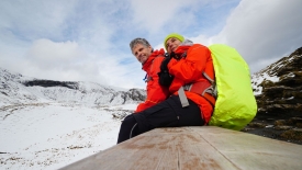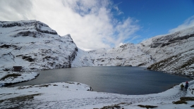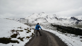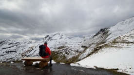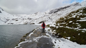 Après un café et un chocolat chaud, nous sortons étudier le ciel. Stefano marche quelques pas sur la passerelle tandis que je reste à l’abri du vent. Nous décidons de monter vers Bachsee.