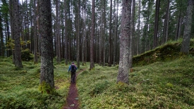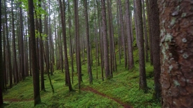 Nous trouvons un magnifique sentier « non-officiel » qui traverse une forêt de pins au tronc parfaitement rectiligne.