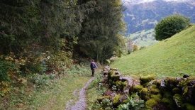 A nouveau sur la route pour quelques mètres, nous retrouvons un sentier qui, selon le GPS, devrait nous amener tout près de Uf em Stutz. Sentier bordé d’un mur de pierre sèche, s’il vous plait !