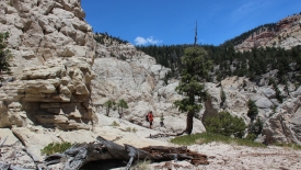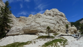 Effectivement, un sacré trou… Ici, la roche est blanche, striée et quelques pins tentent de survivre.