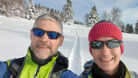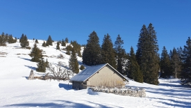 Nous pique-niquons à Druchaux, à l’extérieur, même si la porte est ouverte et la cuisine bien rangée. C’est là que Stefano propose ce à quoi j’avais pensé tout bas : descendre en direction de La Corne, du pré de St-Livres, de la Foirausaz pour remonter vers les Monts de Bière Devant. Une boucle inhabituelle. Et un joli programme. Même s’il y a de fortes chances que nous coupions nos traces de ce matin.
