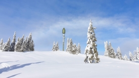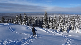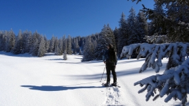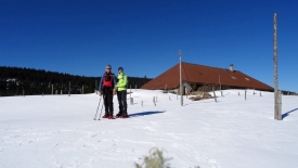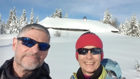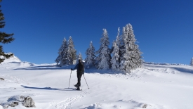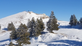 Sans avoir initialement l’objectif de monter à La Dôle, de fil en aiguille, nous passons Le Vuarne, le chalet des Apprentis et arrivons au col de Porte. La montée en dévers est aussi délicate et incertaine que dans nos souvenirs mais il suffit d’aller doucement et de poser bien enfoncer la raquette dans la neige avant de lever l’autre pied.