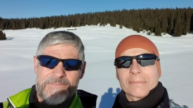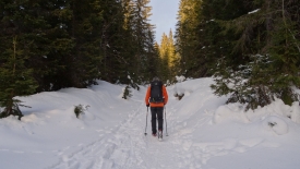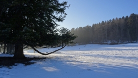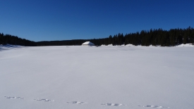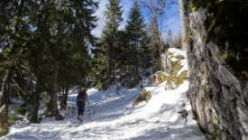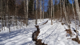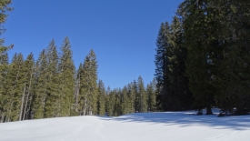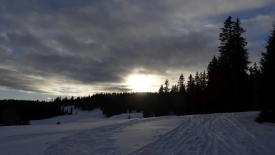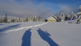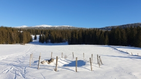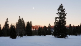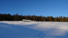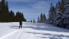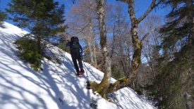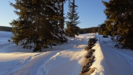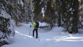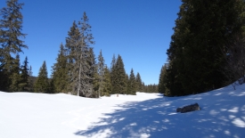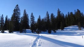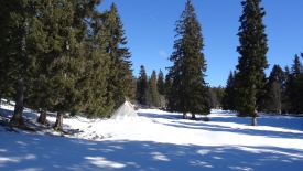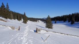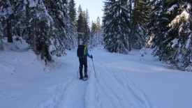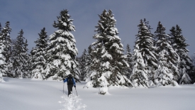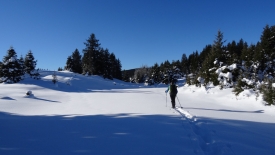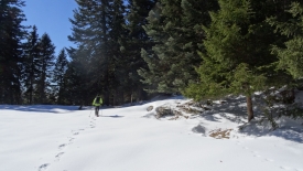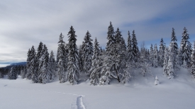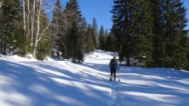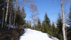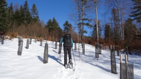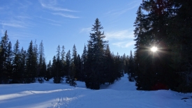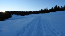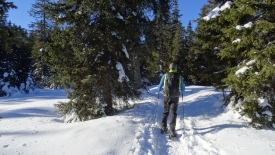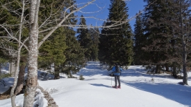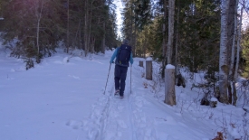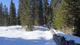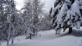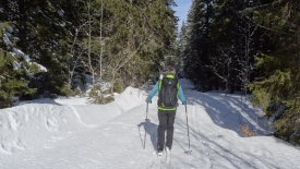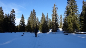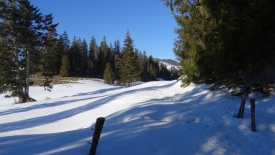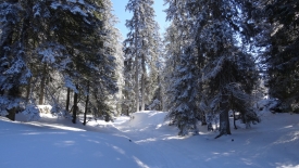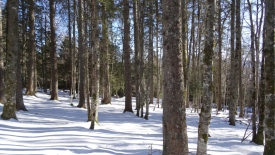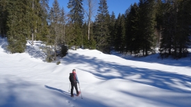 La neige est aussi dure qu’hier, ce qui nous permet de quitter très rapidement le sentier principal, pour un sentier parallèle qui longe l’orée de la forêt.