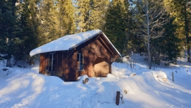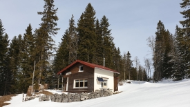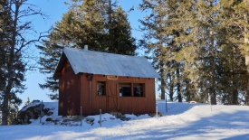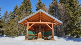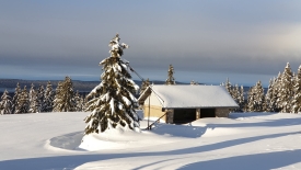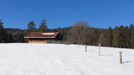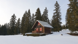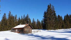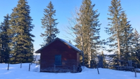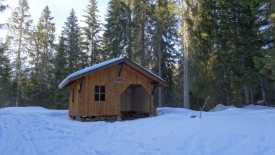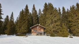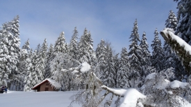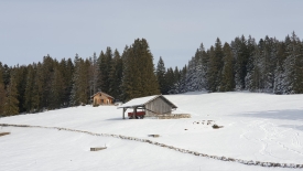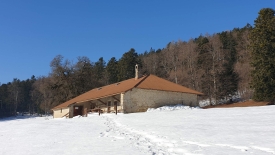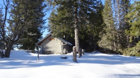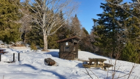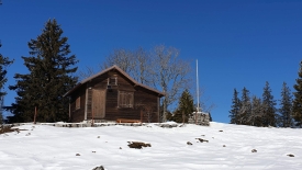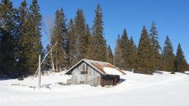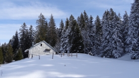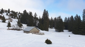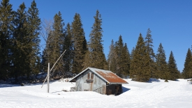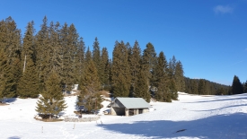 Nous montons dans les sapins et arrivons à la cabane du Bois Gentil.