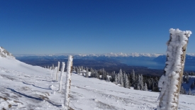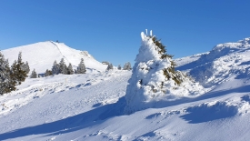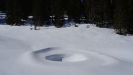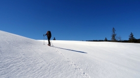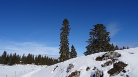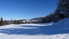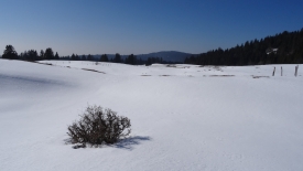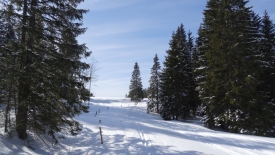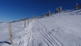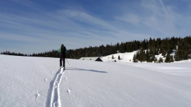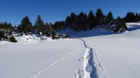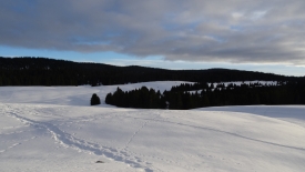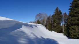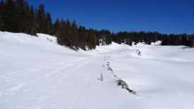 Nous restons dans la combe. Le soleil n’est plus au zénith et se reflète sur la surface vallonnée marquées de quelques traces d’animaux. Et encore, la neige est si dure que seules des empreintes à peine marquées témoignent de leur passage. Nous avons l’impression d’être seuls au monde, impression que nous avons eu souvent aujourd’hui, en dépit des parking bondés.