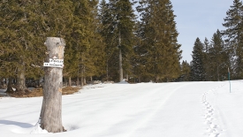 Comme promis ce matin par Stefano, nous rendons visite au couvert des Monts de Bière Derrière avant de redescendre par un sentier parallèle au sentier des Crêtes. Il passe dans la forêt où le froid s’est installé, nous forçant à rajouter une couche. C’est la première fois de tout l’hiver que j’ai gardé ma doudoune durant presque toute la balade.