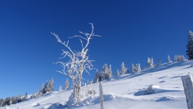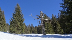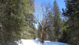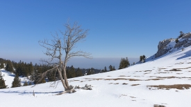 Comme je l’espérais secrètement, Stefano propose l’ascension du Mont Tendre. En passant par Les Rochettes et notre petit arbre fétiche qui a subi les affres de l’hiver : le vent (ou le poids de la neige) a brisé une branche.
