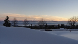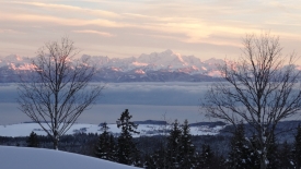 Le ciel est jaune et l’horizon vire au rouge alors que nous rentrons à la maison. La chaîne des Alpes est parfaitement dessinée. Je repère au loin La Tournette, au dessus d’Annecy.