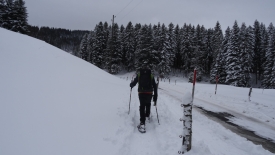 Les prévisions météo sont un peu mitigées et nous ne sommes pas certains d’avoir beau temps. Néanmoins, aucune précipitation n’est annoncée. A peine quittons-nous notre village que les champs sont déjà blancs. Alors vous imaginez bien que plus nous montons, plus le blanc devient intense. Avec surprise, quelques taches de ciel bleu viennent ajouter un contraste du plus bel effet.