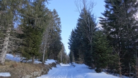 Nous suivons la piste verte, déserte, car les remontées mécaniques sont fermées. Elle passe en bonne partie dans la forêt.